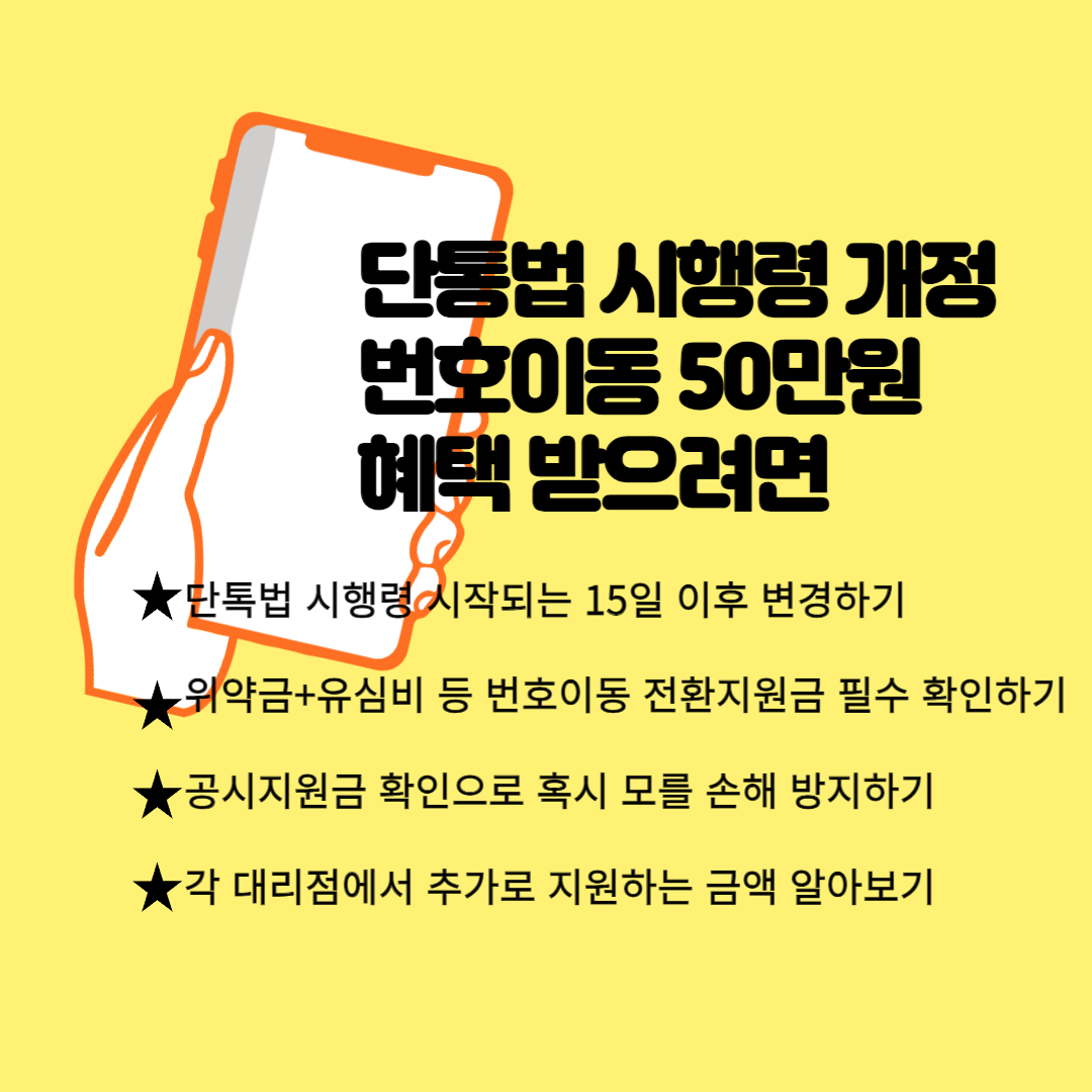 2024년 3월14일부터 휴대폰 통신사를 옮기는 번호이동 가입자에게 최대 50만원까지 번호이동 전환지원금을 지원한다고 합니다.